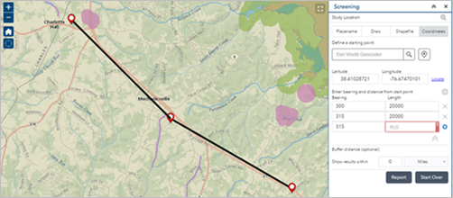 The Screening widget allows you to define an area of interest and analyze specified layers for potential impacts. The area of interest can be defined through a place name search, by drawing on the map, by uploading a shapefile, or by entering a traverse with coordinate and distance pairs. Analysis results can be inspected in the widget and, optionally, shared via a printed report, CSV file download, or feature download.